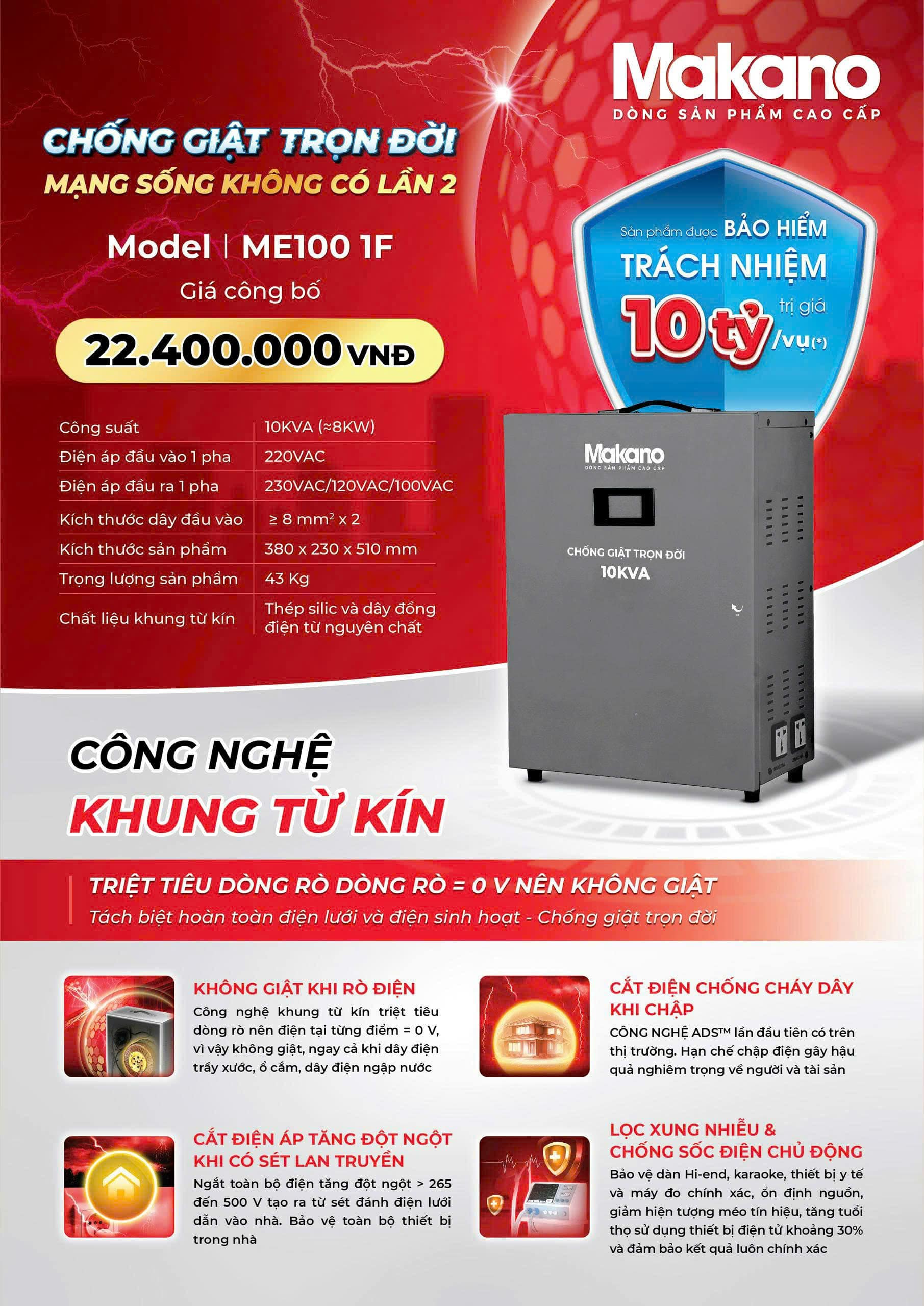 Chống giật trọn đời MAKANO 10KVA DE100 1F là thiết bị điện đầu nguồn, tách biệt hoàn toàn điện lưới khỏi hệ thống điện trong nhà bằng Công nghệ khung từ kín, được đăng ký bảo hộ sáng chế khoa học tại cục sở hữu trí tuệ: